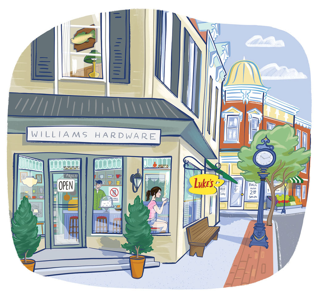 Half page illustration for "Meet Me At Luke's" by Kristine Eckart. Andrews McMeel Publishing